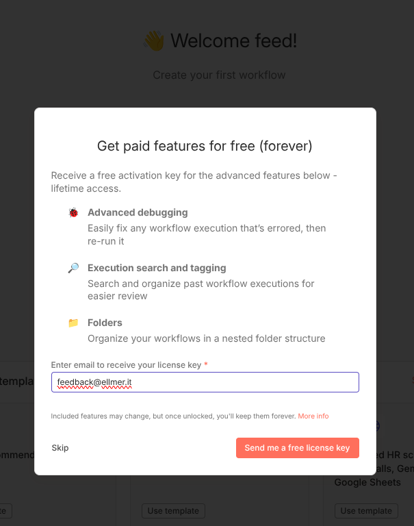 Nach dem Erstellen des Kontos bietet dir n8n an, erweiterte Features kostenlos freizuschalten („Get paid features for free“). Dazu gehört z.B. das Debugging oder granulare Nutzerrechte.