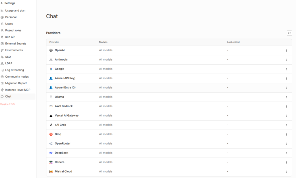 n8n ist mittlerweile extrem mächtig im Bereich KI. Damit wir das nutzen können, müssen wir die entsprechenden Provider aktivieren.