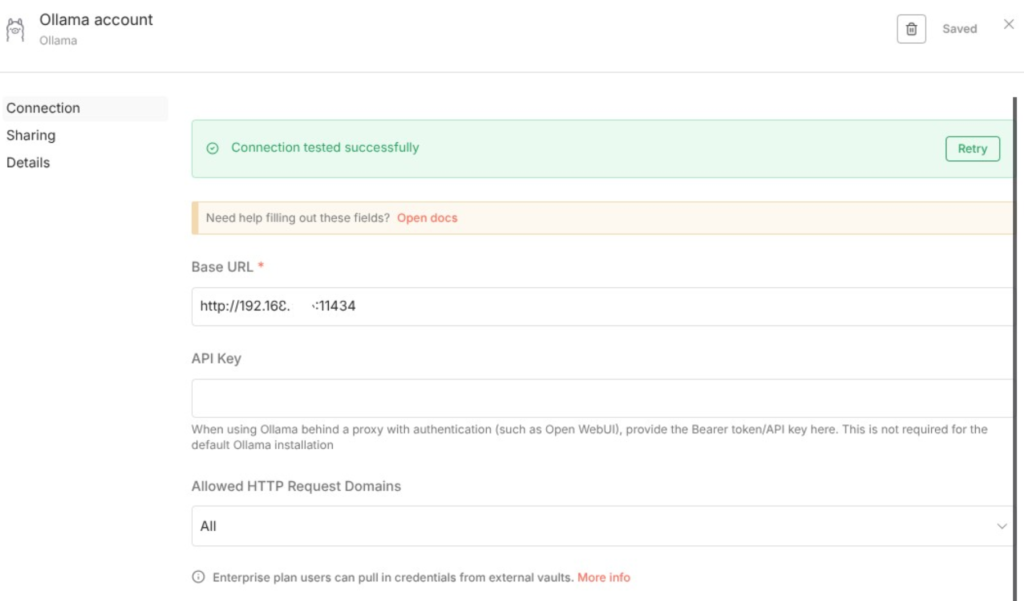Danach musst du die Verbindung herstellen (Credentials). Erstelle neue Credentials und gib die Base URL deines Ollama-Servers an.