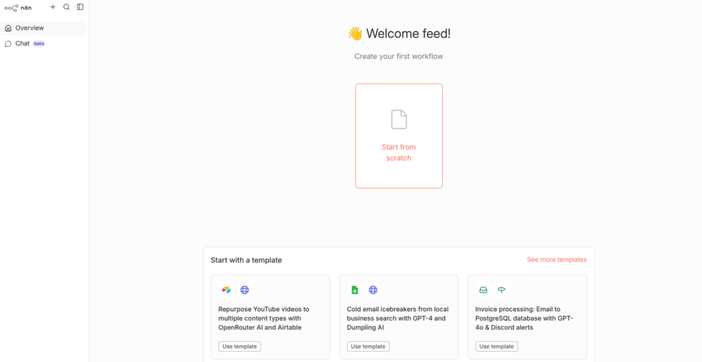 Du landest auf dem leeren Dashboard. Klicke auf „Create your first workflow“ oder „Start from scratch“.