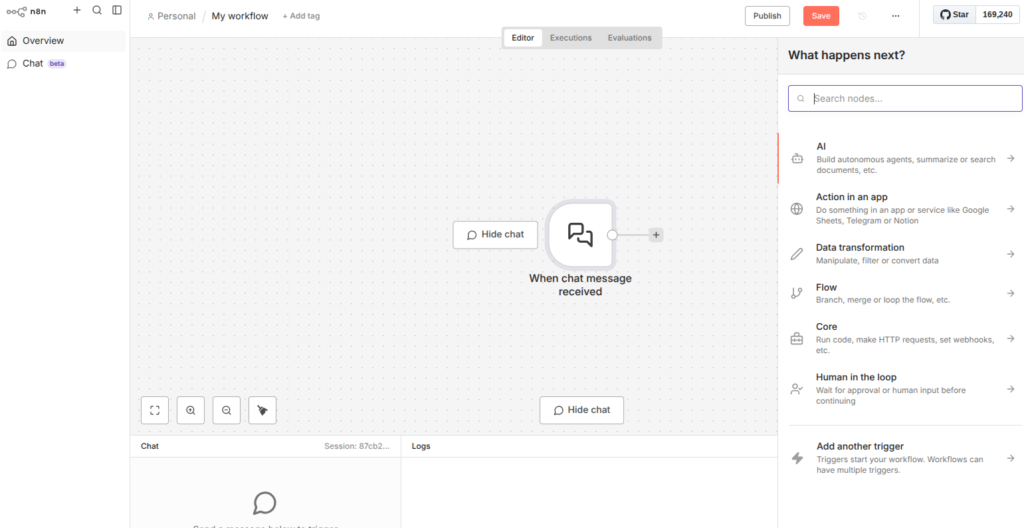 Jeder Workflow braucht einen Auslöser. Suche im Trigger-Menü nach „On chat message“. Das bedeutet, der Workflow startet, sobald jemand im Chat-Fenster eine Nachricht tippt.