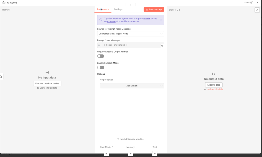 Wähle anschließend den AI Agent Node. Dieser ist das „Gehirn“, das die Anfrage verarbeitet.