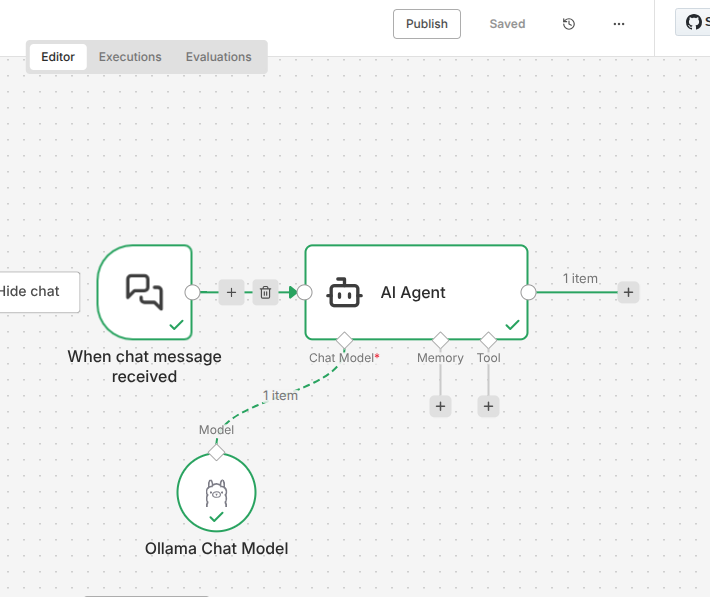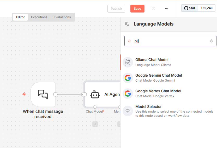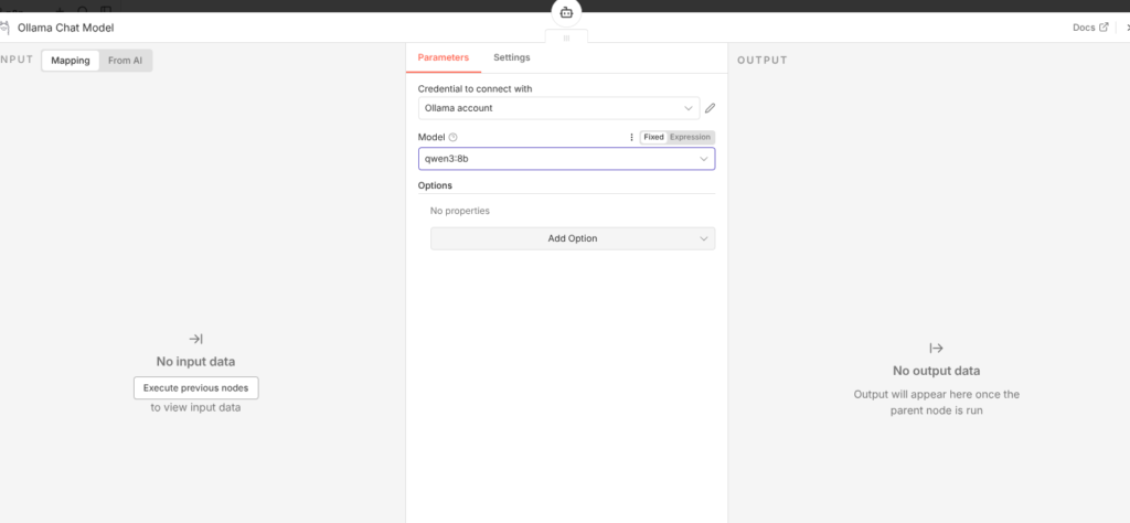 Der AI Agent braucht ein Sprachmodell. Klicke unten am Agent-Node auf den Anschluss für „Model“ und wähle Ollama Chat Model.
